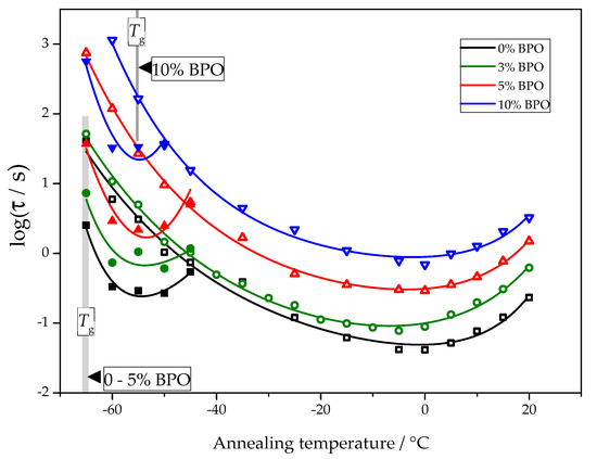 where is the maximum of the cold crystallization enthalpy of the considered polymer, is the halftime of nucleation, is the Avrami exponent for the nucleation process. For the rest of the curves and were kept fixed, and only nucleation halftime was allowed to fit. Again, the points after the extremum of the curve were discarded since they are strongly disturbed by the growth of crystals.