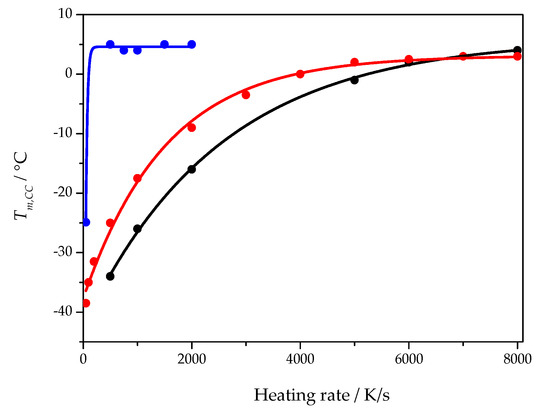 Disentangling the influence of heterogenous nucleation kinetics and growth rate requires some general considerations. Starting from the Johnson–Mehl–Avrami–Kolmogorov (JMAK) approach [18,26], the temperature of the maximum growth rate becomes accessible [25]. On heating an amorphous but nuclei containing sample, cold crystallization is observed, see Figure 2. The cold crystallization peak maximum shifts to higher temperatures with increasing heating rate before the peak eventually vanishes. From the theoretical analysis, it follows that the position of the peak before it vanishes approaches the temperature of the maximum crystal growth rate. The heating rate at which the cold crystallization temperature reaches a plateau depends on the nucleation state of the sample. Figure 7 shows the heating rate dependence of the cold crystallization peak temperature for three different samples of the cross-linked PCL with 5% BPO. The blue curve was obtained when the sample was heated quickly (1 s isotherm at −80 °C) after rapid cooling at 5000 K/s to −80 °C. Red and black curves were obtained from two distinct samples (with different mass and geometry) after annealing (nucleating) the samples at −60 °C for 20 s (1000 K/s cooling rate). As can be seen from Figure 7, depending on the sample history, distinct dependencies of the cold crystallization peak temperature on the heating rate are obtained, but the asymptotic temperatures of all curves are nearly the same. The heating rate when the non-nucleated sample reaches the asymptotic cold crystallization peak temperature is much lower than that for the nucleated samples. It indicates that the critical heating rate for preventing nucleation is much lower than the critical heating rate for preventing crystal growth from preexisiting nuclei. In both cases the temperature of maximum growth rate provides the limit for observable crystal growth.
