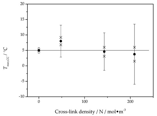 The asymptotic value from fits by Equation (3) to data, as shown in Figure 7, as a function of cross-link density. The horizontal line marks the mean value nearly equal to 5 °C. Crosses represent the the values of estimated from distinct samples of PCL, solid circles represent the average value of from different samples, error bars indicate the expanded uncertainty of the estimate.