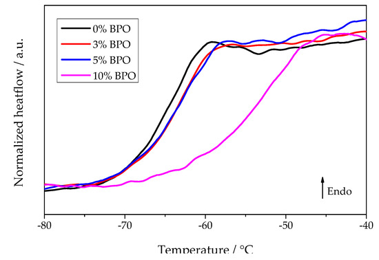 The optimal heating rate for the analysis scans for the cross-linked PCL samples must be chosen depending on the crystallization rate of the particular polymer. Too slow heating will promote crystallization of the polymer during the analysis scan originating from a few heterogeneous nuclei. At the same time, too fast heating causes a broadening of the cold crystallization peak or even disappearance of cold crystallization and makes an independent evaluation of cold-crystallization and melting enthalpies impossible. As shown previously [9], the crystallization rate of the cross-linked PCL slows down with an increasing degree of cross-linking. Thus, the optimal heating rate depends on the cross-link density. The chosen heating rates were 5000 K/s for pure PCL, 3000 K/s for cross-linked PCL with 3% BPO, 1000 K/s for cross-linked PCL with 5% BPO, and 500 K/s for cross-linked PCL with 10% BPO.