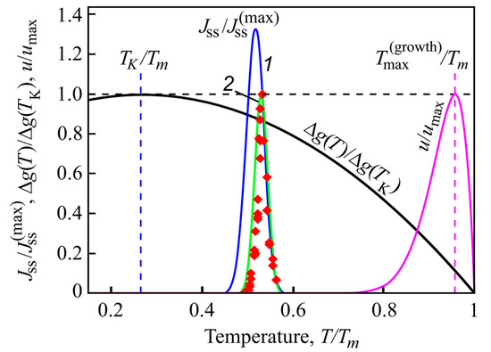 Normalized steady-state nucleation rate, and normalized crystal growth rate, u/umax, in dependence on reduced temperature, T/Tm. Here, is the maximum nucleation rate and umax is the maximum growth rate obtained via experiment, Tm is the melting or liquidus temperature. The blue curve (1) shows the theoretical result when the kinetic term in the expression for the nucleation rate is determined via appropriate diffusion coefficients, the green curve (2) is drawn under assumption of validity of the Stokes–Einstein–Eyring equation allowing one to replace the diffusion coefficient by viscosity. Its wide coincidence with experimental data is reached by employing appropriate expressions for the curvature dependence of the surface tension. The reduced thermodynamic driving force, ∆g(T)/∆g(TK), is shown as well, it has a maximum at the Kauzmann temperature, TK. It is evident that crystallization occurs only in a relatively small temperature range. Typically, the maximum of the growth rate, , is located at temperatures much higher than the maximum of the steady-state nucleation nucleation rate. Reproduced from [35], Figure 1 therein, (2018).