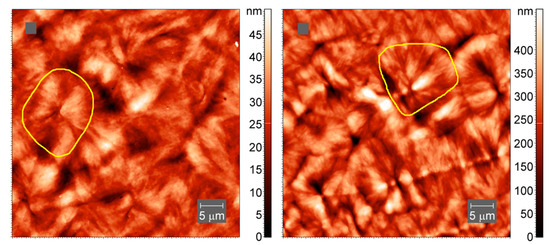 AFM tapping-mode images of spherulites in neat PCL (left) and cross-linked PCL with 5% BPO (right). Yellow lines outline one spherulite.