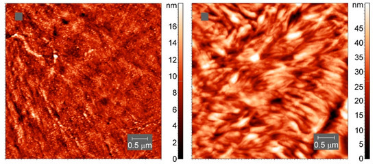 AFM tapping-mode height images of spherulites in neat PCL (left) and cross-linked PCL with 5% BPO (right). The color indicates the height.