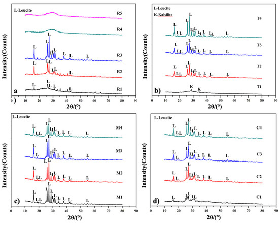 As shown in Figure 2a, when the potassium hydroxide exceeds the potassium silicate, the phase of KGL is amorphous. In contrast, when the potassium silicate is similar to or exceeds the potassium hydroxide, the leucite phase will appear. However, if potassium silicate alone is added, the intensity of the leucite is low. Therefore, the optimal alkaline ratio is R3, where the potassium hydroxide to potassium silicate ratio is 1:1.
