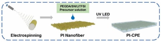 LiTFSI (99%, Aladdin) and SN (99%, Macklin, Shanghai, China) were dissolved in PEGDA (~700, Macklin) in Ar filled glovebox with a mass ratio of 4:4:2 followed by magnetical stirring for 4 h, then 1 wt.% of photoinitiator CIBA (IRGACURE 819) (with respect to PEGDA) were added to obtain homogeneous precursor solution. To stabilize the interface between electrolyte and Li metal, 1 wt.% of LiNO3 (99.99%, Aladdin, with respect to total weight) was added to the precursor solution. The as-prepared precursor solution was dipped onto PI nanofiber film and allowed to stand for 5 min to let solution filtrated into the PI film. The obtained composite membrane was sandwiched between two glass slides and a UV-cured with UVLED machine (UVB 365 nm, XM210, Aventk, Shanghai, China). The prepared CPE film is named PI–CPE.