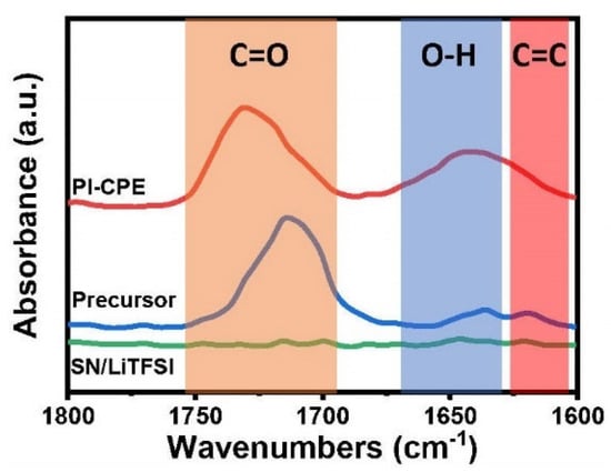 The solidification of precursor solution under UV irradiation is contributed by the crosslinking of PEGDA molecule. To verify the reaction, FTIR of PI–CPE, precursor solution, and pure SN/LiTFSI without PEGDA are performed, and results are shown in Figure 4. Without PEGDA, spectra of SN/LiTFSI shows a flat line, and no peak can be seen at the wavenumber range from 1600 to 1800 cm−1. Compared with precursor solution, after UV polymerization, the characteristic peak of C=C at 1617 cm−1 of PI–CPE disappears, and the adsorption peak of C=O stretching at 1713 cm−1 blue shifts to 1731 cm−1, which confirms the breaking of C=C bonds and involvement of PEG back-bones. So, the PI–CPE has been well UV cured for a free-standing solid electrolyte. The peak is present at 1640 cm−1 with respect to the OH bending mode of water due to the absorption of moisture when exposed to air.