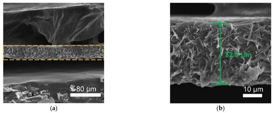 (a) and (b) are cross-sectional SEM images of PI–CPE at different magnifications.