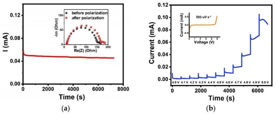 (a) Current-time curve and EIS plots before and after polarization for PI-CPE with Li||Li cell. (b) Electrochemical floating analysis with C–Al|PI–CPE|Li cell; inset is the LSV curve at a scan rate of 500 uV s−1.