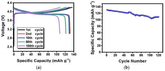 The Li||Li symmetric cell is used to test whether this PI–CPE is compatible with the Li metal anode. Cycling test was carried out under a density of 0.1 mA cm2 and 1 h for each cycle at room temperature in Figure 9. The symmetric cell shows stable Li plating and stripping process. After cycling for 400 h, the overpotential only slightly increases from 18 mV to 24 mV. The good compatibility of PI–CPE with Li anode make it qualified for the SSBs. LCO|PI–CPE|Li coin cells are made to test the performance of PI–CPE film as SSE. LCO cathode is filled with the precursor solution same as PI–CPE and cured under a UV lamp. The LCO|PI–CPE|Li coin cell was cycled at room temperature. Figure 10a shows the voltage profile with a rate of 0.2 C. The initial charge and discharge specific capacity are 136.8 mAh g−1 and 131.1 mAh g−1, and the first-cycle coulombic efficiency is 95.8%. After 100 cycles, the over potential at the 100th cycle is no big difference with the 1st cycle, which shows good cycling stability. The LCO|PI–CPE|Li cell presents excellent cycling performance with 83.3% discharge capacity retention after 120 cycles at 0.2 C under room temperature. The high-voltage-compatible is also demonstrated in this test because of the use of LCO high voltage cathode.