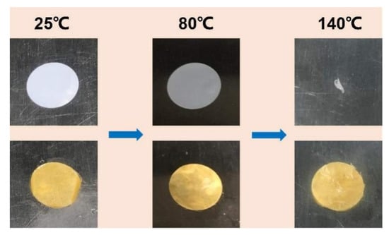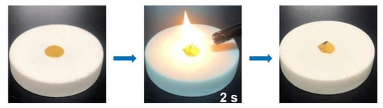 Thermal stability is a very important parameter, which will reduce the risk of thermal runaway caused by short circuit. Commercial PP separator is used as comparison. PP and PI–CPE were heated from room temperature to 80 °C and 140 °C (Figure 11). From the pictures we can see that, when heated to 140 °C, PP shrinks to a point, and PI–CPE can still maintain its initial structure. The excellent stability of PI–CPE is mainly because the supporting matrix of PI fiber film. To test the fireproof property of PI–CPE, a flame test was also adopted. As shown in Figure 12, when exposed to the flame for 2 s, PI–CPE did not catch fire, showing a flame retardant property. Firstly, PI is highly thermally stable. Besides, SN will release CO, CO2, NO gas, etc., under high temperature, which can serve as fire extinguishing agent. So, the as-prepared PI–CPE is fireproof that is promising for high-safe SSBs.
