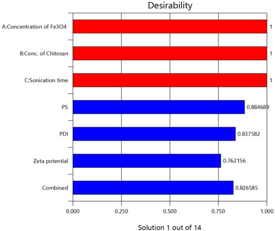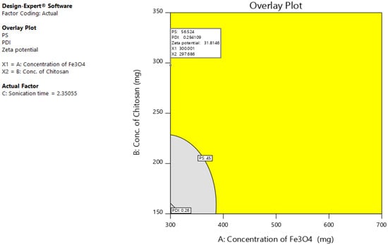 | Run | A:Conc. of Fe3O4 (g) | B:Conc. of Chitosan (g) | C:Sonication Time (h) | Particle Size (nm) | Polydispersity Index | Zeta Potential (mV) |