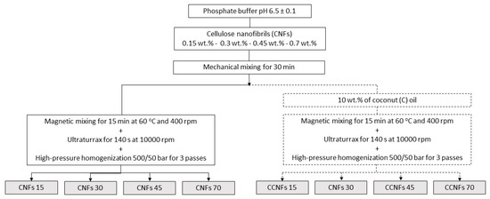Scheme of the processing of suspensions of CNFs without oil and of emulsions of CNFs with coconut oil. CNFs contents of 0.15, 0.3, 0.45 and 0.7 wt.% were evaluated. Oil-free suspensions are CNFs15, CNFs30, CNFs45 or CNFs70, respectively. Emulsions with CNFs and coconut oil are CCNFs15, CCNFs30, CCNFs45 and CCNFs70.