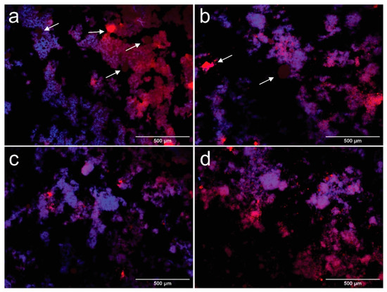 Fluorescence microscopy images of CPCNFs15 taken at 100× (a) and 400× (b) and CPCNFs70 taken at 100× (c) and 400× (d) after 1 day of their manufacture. CNFs are colored in blue and oil droplets are colored in red. Oil droplets outside the cellulosic structure are pointed by arrows in the images.