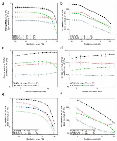 In the present work, the hysteresis of the resultant suspensions was also evaluated. After deforming the structure to an amplitude of 100%, and breaking the fibril network, it is observed that there is a recovery in G′ and G″ in all the samples evaluated (Figure 7e,f). Structural recovery is more marked in CCNFs15 and CPCNFs15, indicating a simpler aggregation (Figure 7e). CCNFs70 and CPCNFs70 show a lower recovery after breaking the structure, which is coherent with the complex structure mentioned in the amplitude sweep.