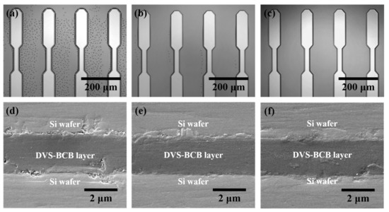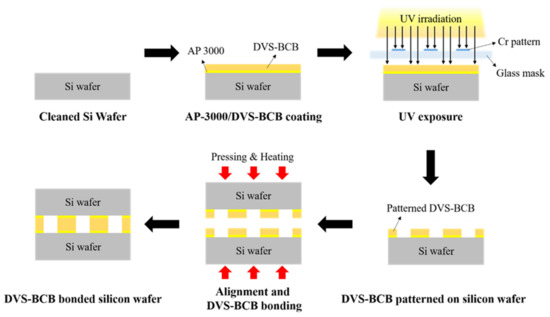Owing to the development of the semiconductor industry, bonding wafers with complex structures of semiconductors and micro-electromechanical systems (MEMS) devices without interconnection delay, low adhesive strength, crosstalk, and power dissipation have attracted significant attention [1,2]. In particular, with increasingly precise device structures, it is imperative to maintain good junctions, even in narrow spans, such as between patterned arrays. Generally, processes such as metal eutectic bonding, metal thermocompression bonding, silicon fusion bonding, anodic bonding, and adhesive bonding are used to bond wafers [3]. Adhesive bonding is one of the main processes with the advantages of high yield, low cost, high bonding strength, relatively low bonding temperature, wide applicability to various wafer materials, no requirement for electric voltage, and complementary metal–oxide–semiconductor and MEMS compatibility [3,4]. This adhesive wafer bonding uses various polymers, such as polyimide [5], photoresist [6], epoxy [7], and divinyl siloxane bis-benzocyclobutene (DVS-BCB) [8,9] as an intermediate bonding material. In particular, the commercial dielectric polymer, i.e., DVS-BCB, has attracted significant attention, owing to its excellent properties, such as low dielectric constant (~2.65 for the frequency range of 10 Hz to 1 MHz), low moisture absorption, low cure temperature, high degree of planarization, low level of ionic contaminants, high optical clarity, good thermal stability, excellent chemical resistance, and good compatibility with various metallization systems [10,11,12,13,14]. Therefore, DVS-BCB is used in bonding and packaging processes for three-dimensional (3D) integrated circuit [4,15], optical [16,17], and MEMS devices [17,18,19].
