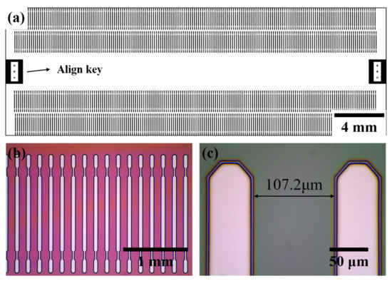 We measured optical microscopy images, as shown in Figure 4, to observe the patterned DVS-BCB layer exposed to the UV light passing through the glass mask. Figure 4a shows a schematic of manufacturing a glass mask, and 177 pattern arrays with a pitch of 107.2 μm are arranged in one line to obtain a total of 708 pattern arrays. In addition, a glass mask was prepared by arranging an alignment key for alignment at both ends of the center. Optical microscopic images of the 3D DVS-BCB pattern fabricated using the prepared glass mask are shown in Figure 4b,c. As shown in Figure 4b, the manufactured DVS-BCB pattern was produced in a uniformly well-aligned pattern without deformation. In addition, as shown in Figure 4c, the DVS-BCB pattern and the developed interface are identical and have a clean shape. The fabricated DVS-BCB layer was subjected to Raman spectroscopy to determine whether all the DVS-BCB layers inside the pattern were removed through the development process. From Figure S3, it can be confirmed that all the DVS-BCBs were removed by the development process [35]. This confirms that the 3D DVS-BCB layer prepared for DVS-BCB bonding was fabricated with high quality without defects or shape collapse.