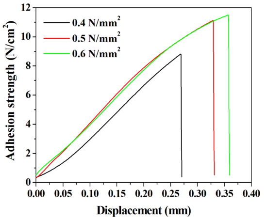 We confirmed the presence of voids and the behavior of chemical bonds in the DVS-BCB bonding fabricated according to the compressive pressure through near-infrared confocal laser microscopy and FT-IR analysis. We conducted a tensile test using a universal testing machine to investigate the effect of these properties on the adhesive strength of the DVS-BCB bonding. In the tensile test, an aluminum jig with dimension of 12.5 mm × 32 mm × 14.5 mm (w × l × h) and the prepared sample were strongly attached, using AXIA EP-04 (tensile shear strength of 2962 N/cm2) epoxy. We used epoxy with high adhesion strength to cut the DVS-BCB layer and confirmed that the DVS-BCB bonding layer was detached, as shown in Figure S4. Figure 7 shows the results of the adhesion test of the prepared sample, and it was confirmed that the adhesion strengths were 8.82, 11.13, and 11.50 N/cm2 at compressive pressures of 0.4, 0.5, and 0.6 N/mm2, respectively. These results are consistent with the results of Figure 5 and Figure 6, wherein the highest adhesive strength is expected at the compressive pressure of 0.6 N/mm2. The adhesive strength at 0.4 N/mm2 is lower than those at 0.5 and 0.6 N/mm2, owing to the presence of a large number of voids and low chemical bonding. From the results of 0.5 and 0.6 N/mm2, it can be seen that the increase in the adhesion strength line shape with respect to the displacement is similar. Furthermore, it was confirmed that the compressive pressure of 0.6 N/mm2 resulted in greater adhesion strength by 0.37 N/cm2 than the compressive pressure of 0.5 N/mm2; this phenomenon can be attributed to the difference in the number of chemical bonds rather than the presence of voids generated during the DVS-BCB bonding process. Based on these results, we confirmed that the morphological, chemical, and physical analysis results of the DVS-BCB bonding are in good agreement. In the DVS-BCB bonding process, the high compressive pressure induces high stress on the high-density pattern array. These high stresses can destroy or crack the high-density pattern array structure. Therefore, we propose that the optimized compressive pressure condition for void-free DVS-BCB bonding is 0.6 N/mm2. We carried out near-infrared confocal laser microscopy to examine the presence of voids even in DVS-BCB bonding with different patterns under the proposed compressive pressure condition of 0.6 N/mm2. It was confirmed that there was no void in the super high-density patterns and linear patterns, as shown in Figure S5a,b, respectively. This indicates that our proposed DVS-BCB bonding process has excellent reproducibility and good bonding in various patterns.