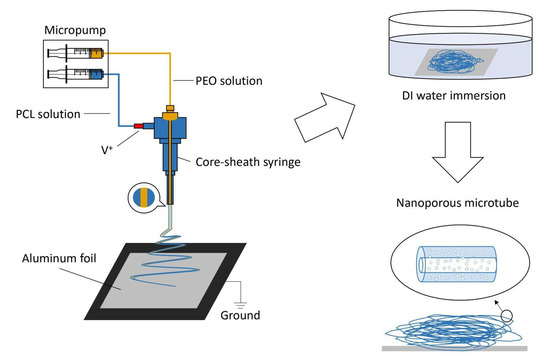 A schematic illustration of processing the electrospun microtubes is shown in Figure 1. By adopting the coaxial spinneret, PCL/PEO and PEO solutions were electrospun simultaneously into microfibers with a core-sheath structure. The fabricated microfibers were collected by aluminum foil and immersed in deionized water overnight to dissolve the PEO. After the water bath and air-drying process at room temperature, the hollow structure was formed and the pores on the sheath also showed up.