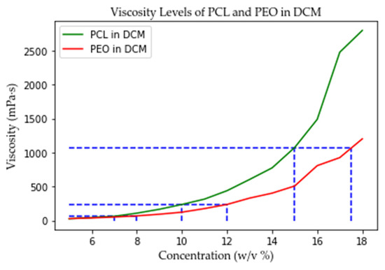 The solution concentrations were selected according to the viscosity levels of PCL and PEO (Figure 3). The viscosity differences between same level concentration PCL and PEO solutions were negligible compared to different level solutions. The viscosities of the polymer solutions were measured by a digital rotational viscometer (IKA, Wilmington, NC, USA).