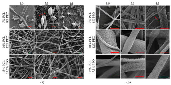In this study, DCM was used for both core and sheath solutions due to its high volatility, which contributes to the surface nanopore formation. In addition, we mixed water-soluble PEO with PCL for sheath solution and investigated the effects of the PCL/PEO ratio on the nanopore formation. The PEO in the sheath solution significantly increased the pore depth but had little effect on the pore size. In addition, no pores were found on the microbeads or microtubes when the solution viscosity was low. This is probably because the vicinity of the sheath surface was saturated with DCM due to the high volatility of DCM and low PEO concentration. As a result, it was more difficult for water vapor to penetrate the DCM vapor and reach the solid-air interface to form pores [43]. When the sheath solution viscosity increased to 237 mPa·s (Groups 5, 6, 8, and 9), the addition of PEO facilitated the pore formation. This is consistent with Li et al.’s study that the pore size increased when adding water-soluble solvent into the solution [44]. However, when the PCL/PEO ratio increased from 3:1 to 1:1, the pore size increased when the sheath solution viscosity was 237 mPa·s, but the pore size decreased when the sheath solution viscosity was 1077 mPa·s. This mixed result is also consistent with other studies [44,45,46,47]. It showed that viscosity and PEO ratio have interactive effects on pore size.
