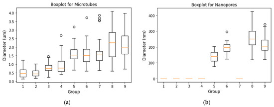 (a) Boxplot of microtubes’ and (b) nanopores’ diameter.