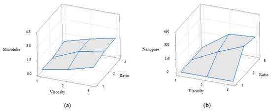 Statistical analysis of microtube diameter and pore size was conducted by Minitab using a 3 × 3 design. The two factors are solution viscosity and PCL/PEO ratio in sheath solutions. The viscosity has three levels: low, middle, and high, and the ratios have three levels: 0, 3:1, and 1:1. Figure 6a shows the surface change response of microtube diameter with different viscosity and PCL/PEO ration, and Figure 6b shows the surface change response of nanopores. In these two plots, 1–3 in x axis stands for low, middle, and high three viscosity levels. 1–3 in y axis stands for 0, 3:1, and 1:1 three ratio levels. The z axis in Figure 6a shows the diameter of microtubes and the z axis in Figure 6b indicates the range of pore sizes.