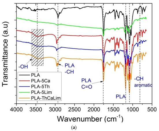 Fourier transform infrared (FTIR) spectroscopy was used for the identification of the characteristic chemical groups of the composites prepared. FTIR spectra of PLA with all combinations of the triple blends together with the spectra of the corresponding material having the individual components and neat PLA are illustrated in Figure 3a–d. Furthermore, in Figure 4 appear the FTIR spectra of all triple and the quadruple composites of PLA with carvacrol, thymol, cinnamaldehyde or limonene.