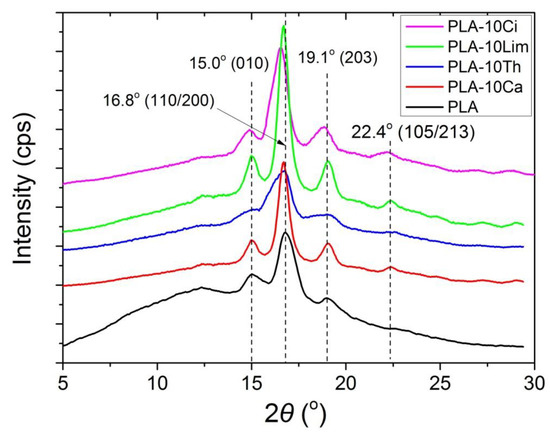 The crystal structure and morphology of the semi-crystalline polyester PLA have been extensively investigated in the literature using many techniques [64,65]. X-ray diffraction is one of the most accurate and representative techniques. It has been reported that PLA crystallizes in several forms, the formation of which depends on the crystallization conditions. The most common α-form occurred in conventional melt and solution crystallization conditions. Therefore, to evaluate the crystal morphologies of pure PLA and their composites, wide-angle X-ray diffraction measurements were performed. Figure 5 shows the XRD patterns of neat PLA and its composites with thymol, carvacrol, limonene and cinnamaldehyde. Neat PLA exhibits a very strong diffraction peak at 2θ = 16.8° due to diffraction from (110) and/or (200) planes and the less intense peaks at 2θ = 15.0 and 19.1°, attributed to reflections of the (010) and (203), respectively. Finally, a shoulder is clear at 22.4°, attributed to reflections of the (105/213) planes. All these are representative peaks of the α-form crystals, indicating that PLA has the typical orthorhombic crystal structure. Similar peaks have been reported in the literature for PLA [64,65].