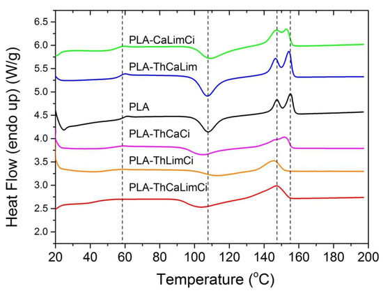 The values thus obtained are included in Table 3. The degree of crystallinity estimated for neat PLA was near 30% and did not change significantly when all different compounds were added; this means that, according also to the XRD results, the crystallinity of the samples was not affected by the presence of the additives.