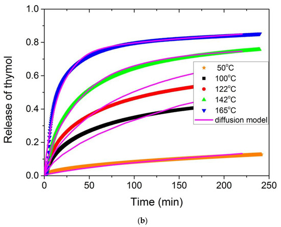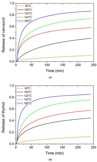 Furthermore, in order to check the small degradation peak observed in the cases of the composites with thymol and carvacrol, release profile studies were performed for these two materials at different temperatures. Particularly, the release of the active component thymol or carvacrol from the polymer matrix was studied at different temperatures using isothermal TGA scans. Five temperatures were selected, i.e., 50, 100, 122, 144 and 165 °C. Results appear in Figure 9a,b for carvacrol and thymol, respectively.