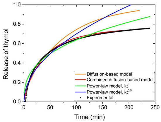 In order to select the appropriate model to simulate the experimental data, the release of thymol was studied at 142 °C. Results from the diffusion-based model (Equation (6)) obtained after optimum fitting estimation of the diffusion coefficient seem to simulate the experimental data very well at the initial stage (until almost 0.5), whereas the values are overestimated at high mass release ratios (Figure 10). Similar behavior was found when the non-Fickian power law-model from Equation (11) was used and particularly very high values at large release times were observed when the exponent n was set fixed and equal to 0.5. It should be noticed that the best-fit value of the exponent n was found to be n = 0.365, meaning that the process is characterized as pseudo-Fickian diffusion. Finally, the simulation was excellent when the combined diffusion model was employed (red line in Figure 10. Of course, one could assume that this may be the result of using three adjustable parameters this time (i.e., f, Df and Ds) instead of two in Equation (11) (i.e., k and n) and one when Equation (6) was used (i.e., D). However, this is partially true. The physical meaning is that, as the amount of the active compound released from the polymer matrix its concentration decreases significantly leading to different diffusivity compared to that estimated when high amounts of the active compounds are present. This explains the terms fast and slow diffusion associated with large and small amounts of the diffusant.
