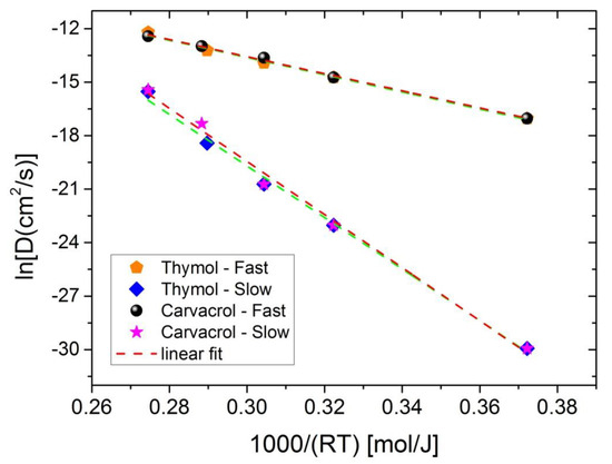 Arrhenius-type plots of the fast and slow diffusion coefficients for the release of thymol and carvacrol in order to estimate the activation energies of the processes.