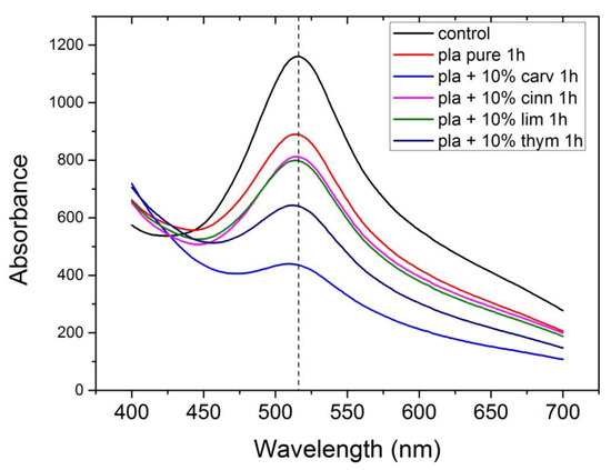 UV spectra of neat PLA and PLA composites with 10% of thymol, carvacrol, limonene and cinnamaldehyde after 1 h in DPPH solution.