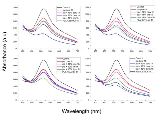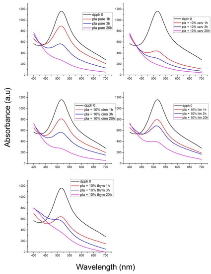 The antioxidant stability of the materials prepared was studied with the DPPH method. DPPH radical scavenging activity is one of the most frequently used methods to predict the antioxidant activity of packaging films [70]. The samples initially present a purple color. The change in color to yellowish is an indication of antioxidant activity of the additive. In order to quantify the change of the color, the UV absorbance of the samples was measured, and UV spectra of the materials studied appear in Figure 13, Figure 14, Figure 15 and Figure 16.