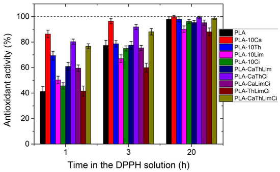 In Figure 13, the UV spectra of neat PLA and PLA composites with 10% of thymol, carvacrol, limonene and cinnamaldehyde after 1 h in DPPH solution is illustrated. All materials exhibit a peak at 516 nm. The higher antioxidant activity was noticed when carvacrol was added, followed by thymol, whereas limonene and cinnamaldehyde presented a similar antioxidant activity. Interesting to point that neat PLA presented also some antioxidant activity. Furthermore, comparative UV spectra of the PLA composites with the triple and the quadruple mixtures, after 1 h in DPPH solution appear in Figure 14. Higher antioxidant ability was observed in the composite including both thymol and carvacrol, whereas the quaternary composite presented slightly lower antioxidant properties since the total amount of the more active compounds, i.e., thymol and carvacrol was lower than in the triple composite. As the amount of the additive was increased, the antioxidant ability was much increased. The effect of the antioxidant ability of each component in the ternary composites is illustrated in Figure 15. Finally, the UV spectra indicating the antioxidant activity as a function of the time remained in the DPPH solution was measured for all materials and result appear in Figure 16. It is seen that after 20 h the composites with thymol and carvacrol exhibit an almost 100% antioxidant ability. These results are quantified when estimating the antioxidant activity via Equation (2). Results for all the composites appear in Figure 17. The increase with time of the antioxidant activity is clear for all samples. Moreover, large differences are observed depending on the compound used. Thus, it is verified that carvacrol exhibits the higher antioxidant capacity followed closely by the composites with the triple mixture of carvacrol–thymol–cinnamaldehyde and the quadruple mixture.