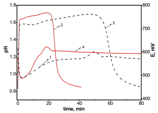 Time dependences of changes in pH (curves 1 and 2) and redox potential (curves 3 and 4) at the oxidation of aniline (curves 1 and 3) and DADCB (curves 2 and 4). Standard conditions.