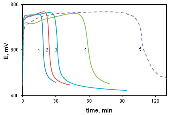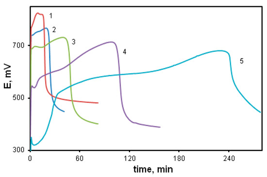 A change in acid concentration also leads to significant changes in the kinetics of the process. Figure 4 shows potentiometric curves of DADCB polymerization at various acid concentrations, as well as in neutral and alkaline media. It can be seen from the figure that pH values mostly affect the induction period. The higher the pH value, the lower the reaction rate at the initial stage (curves 1–3). A similar picture is observed in the polymerization of aniline [13,53]. However, when the reaction is carried out under weak acidic and alkaline conditions (curves 4 and 5), the process of DADCB polymerization is somewhat different from the polymerization of aniline, which is characterized by a shortening of the induction period with the increase in the pH of the solution. In addition, during the polymerization of aniline, the kinetic curves acquire a two-step form [13,53], associated by the authors with a change in the oxidation reaction mechanism at high pH of the medium and with a different structure of the resulting intermediates. In our case, the induction period grows with the increase in pH, and the shape of the curves shows hardly any change. Only a slight decrease in the initial redox potential is observed, and the potentiometric curves become more stretched. It is possible that, in the case of DADCB, a change in the reaction medium pH does not alter the oxidation mechanism, but only accelerates or slows down the process.