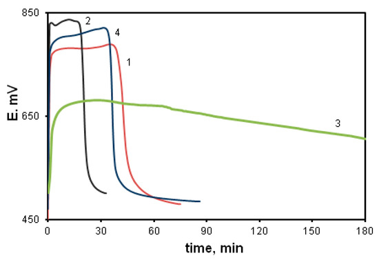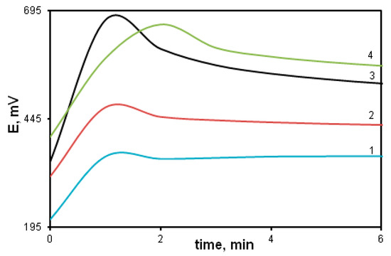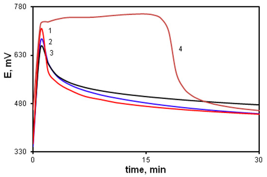 Time dependences of the redox potential during the oxidation reaction of MADCB (1); DADCB (2), and aniline (3) at [HCl] = 0.5 mol/L, as well as MADCB at [HCl] = 1 mol/L (4).
