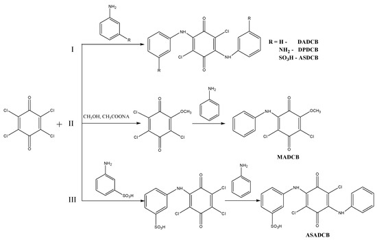 ASADCB was obtained via two-step synthesis. At the first stage, 2-(aniline-3-sulfo)-3,5,6-trichloro-1,4-benzoquinone (ASTCB) was synthesized via alkylation of MA with CA in dioxane. 60 mL of an alcohol solution of MA (0.01 mol) and sodium acetate (0.01 mol) were added dropwise to a solution of 0.02 mol of CA in 200 mL of ethyl alcohol during 30 min under constant stirring. After the reagents were mixed, the reaction solution was stirred for another 4 h at T = 40 °C. Then, the mixture was cooled to room temperature, the reaction mass was filtered, the precipitate was washed with ethanol and dried under vacuum at room temperature to constant weight. The ASTCB yield was ~60% wt. of the yield predicted by theory. ASTCB dissolves in dioxane, DMSO, DMFA and poorly soluble in dilute acid solutions. Elemental analysis: C—34.93%, H—1.45%, N—4.63%, O—19.07%.