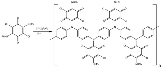 - Kiseleva, S.G.; Orlov, A.V.; Bondarenko, G.N.; Karpacheva, G.P. Oxidative polymerization of 3,6-dianiline-2,5-dichlorbenzoquinone and its copolymerization with aniline. Polym. Sci. B 2018, 60, 717–726. [Google Scholar] [CrossRef]