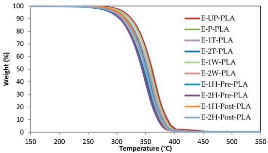 The thermal properties of the extruded samples were assessed using TGA to determine their thermal decomposition profiles in an oxidizing atmosphere. All samples analyzed in this way displayed similar decomposition profiles (Figure 2) consisting of a single mass loss event between 250 and 400 °C [15,37,38]. No significant difference was observed between the monofiller and the hybrid multifiller composites, although it is notable that the samples containing a 2% CNC loading decomposed slightly earlier than those with a 1% CNC loading, as well as the PLA. This was also true of the rate of maximum mass loss, which is clearly seen in Supplementary S3 and is recorded in Table 3 as the inflection point of the DTGA thermograms.