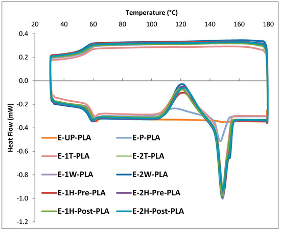 The PLA extruded films (E-UP-PLA) behaved markedly different than the other samples, without clear crystallization or melting temperatures. The k-mixed PLA control films (E-P-PLA) clearly displayed these properties, at lower temperatures than the PLA-CNC composites, however. Therefore, the k-mixing process likely either modified the PLA structure or introduced contamination, which resulted in crystallization that was not observed for films produced by extruding neat PLA resin, consistent with past reports [39].
