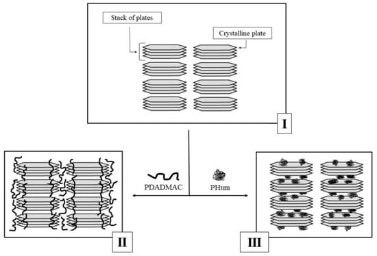 In aqueous media, water penetrates between the stacks while inter-sheet and inter-plate spaces are practically inaccessible for water molecules. Polyelectrolyte macromolecules are able to absorb on the surface of the crystalline plates via electrostatic interactions for positively charged PDADMAC and via hydrogen bonding, ligand exchange, cation bridges and van der Waals interactions for negatively charged PHum [22].