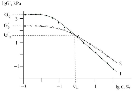 For the kaolinite–PDADMAC composite, Figure 5 shows the typical strain dependences of storage modulus G′ and loss modulus G″. When the strain increases, both G′ and G″ decrease due to mechanically stimulated destruction of the sample structure. At a certain strain εin, the above dependencies intersect, providing the inversion of the elastic and viscous response of the sample. For all samples studied, the values of both initial storage modulus G′0 and initial loss modulus G″0 estimated at strain are not above 0.01 %, as well as the values of storage modulus G′in and strain εin corresponding to the inversion point (Figure 5) are shown in Table 1.