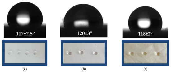 It is well known that bacterial and fungal adhesion is influenced by the surface characteristics and the hydrophilic/hydrophobic balance of the host surface. For this reason, it is important to determine the values of the contact angle of the prepared electrospun materials that will contact the fungal species. The values of the water contact angles for all obtained samples were determined using distilled water droplets, and representative images of the droplets are shown in Figure 2. The PLLA fibrous material was hydrophobic, with a water contact angle of 117° ± 2.5° (Figure 2a). The measured value for the pure PLLA was close to the values found in the literature [35]. The measured contact angle values of the PLLA/5-Cl8Q and PLLA/K5N8Q composite fibrous materials were 120° ± 3° and 118.0° ± 2°, respectively (Figure 2b,c). The measured water contact angle values were close to those measured for the PLLA electrospun material. All of the obtained and studied electrospun fibers had water contact angle values ca. 120° and were hydrophobic.