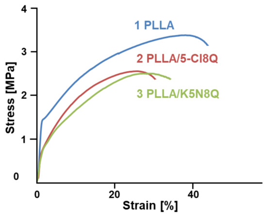 Stress–strain curves of electrospun materials: (1) PLLA, (2) PLLA/5-Cl8Q, and (3) PLLA/K5N8Q.