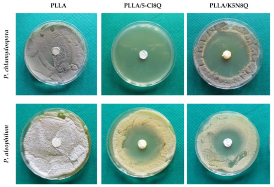 The results obtained in the present study demonstrate that composite fibrous materials containing hydroxyquinoline derivatives have strong antifungal activity. In contrast, neat PLLA fibrous materials do not change the fungal growth or exhibit any antifungal activity.