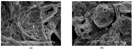 In our previous studies, we showed the successful fabrication of fibrous materials obtained from polyesters by electrospinning [20,32,33]. In concrete, we found that for PLA with MW = 259,000 g/mol and MW/Mn = 1.94, the optimal total polymer concentration for conducting electrospinning resulting in preparation of defect-free cylindrical fibers was 10 wt% in a DCM/EtOH solvent system [20]. However, it is necessary to study the effect of incorporation of a biologically active substance(s) on the morphologies of fibers, their physical–chemical properties, and their ability to inhibit the growth and penetration of pathogenic fungi.