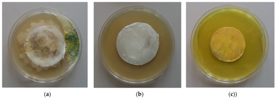 It was of interest to determine not only the ability of the materials to impede the penetration of fungal spores, but also to study if the fibrous materials impede the growth of pathogenic fungi remaining in the material after filtration. Therefore, after filtration, we placed the used disks on a surface of solid agar in a Petri dish in order to determine the growth of the remaining fungi in the fibrous discs. The Petri dishes were incubated for 96 h at 28 °C, and then the fungal growth was determined. Figure 9 presents the growth of P. chlamydospora on the fibrous materials’ surface. It was found that the PLLA fibrous material used in the filtration experiments developed colonies of P. chlamydospora (Figure 9a). The developed colonies showed that this material did not possess antifungal activity. PLLA/5-Cl8Q and PLLA/K5N8Q, which were placed in suitable conditions for the development of remaining spores in the materials, impeded the fungal growth, resulting in compete fungal inhibition (Figure 9b,c).This result indicates that the fungi remaining in the PLLA/5-Cl8Q and PLLA/K5N8Q materials after filtration could not grow due to the antifungal activity of the obtained composite materials.