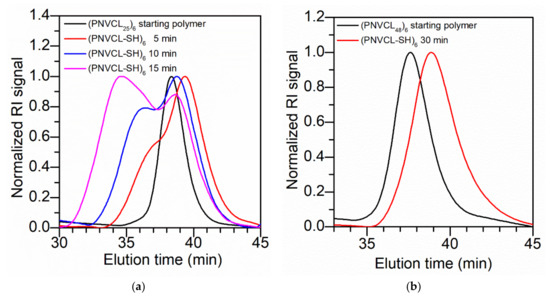 On the other hand, for comparison purposes, aminolysis was also carried out on linear PNVCL polymers using the same optimized conditions reported above (using dichloromethane as solvent). Solutions of linear polymers in THF were prepared and left stirring for different periods of time (1 min and 5, 10 and 24 h) to later be analyzed by GPC. In Figure 3, it can be observed that the chromatogram position of the PNVCL-SH sample with 1 min of stirring in THF also moves to longer retention times, although the displacement is less marked compared with the starting polymer (again, due to interaction of the thiol groups with the column). It should be noted that for the sample at 1 min stirring, a higher molecular weight than the starting polymer (PNVCL-xanthate Mn GPC = 14,400 g/mol vs. PNVCL-SH Mn GPC = 15,600 g/mol) was observed (see Figure 3). This inconsistency has been observed during the GPC analysis of all the terminal thiol end-capped PNVCL polymers, regardless of the topology.